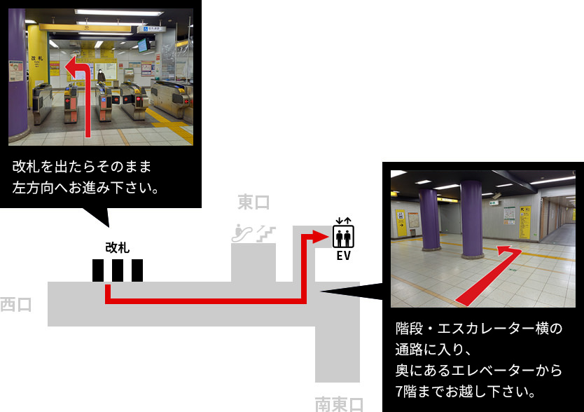 改札をでて左手、一番手前にあるエレベーターで7Fにお越しください。